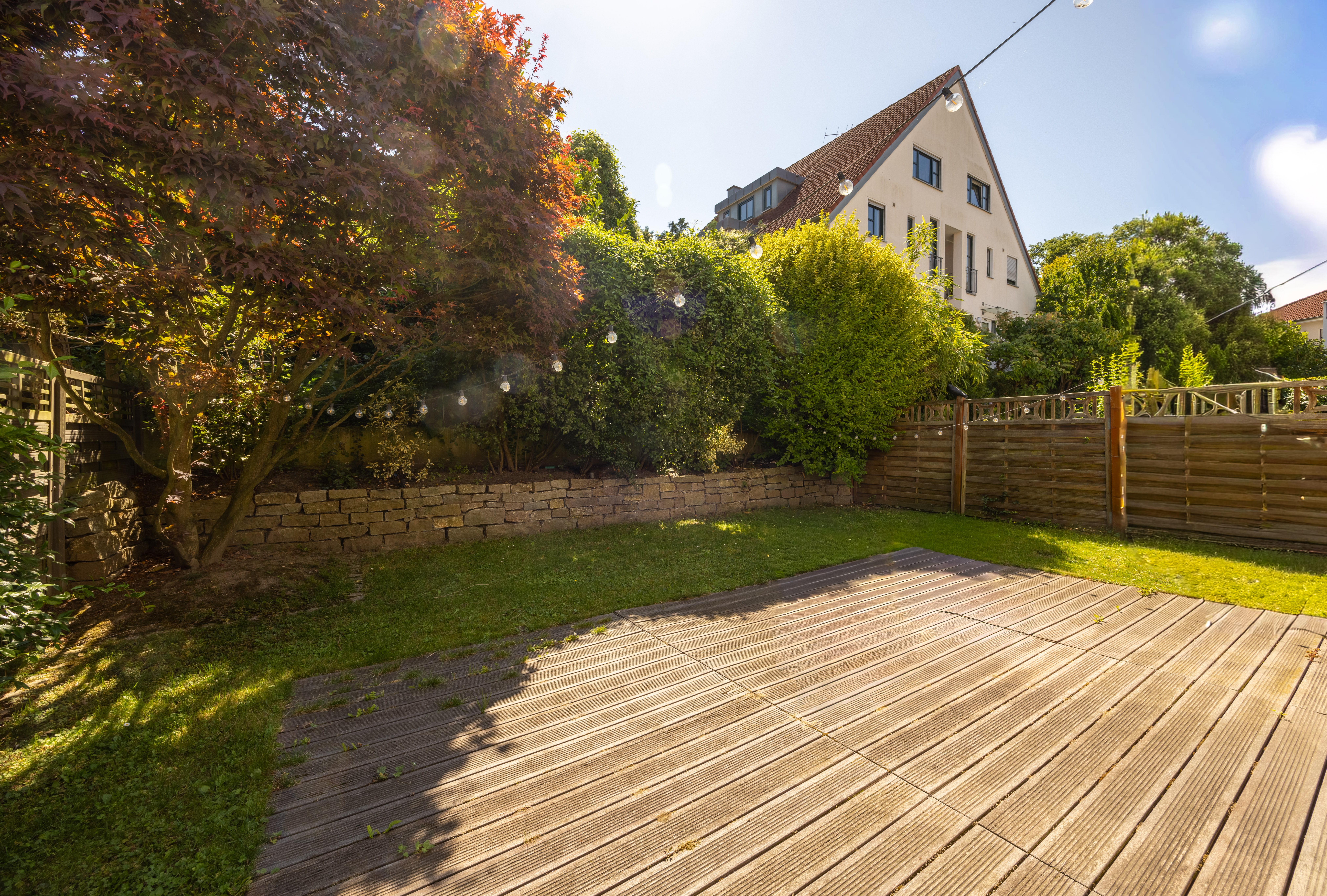 Das Herzstück des Hauses bildet das lichtdurchflutete Wohn- und Esszimmer mit offener Küche und direktem Blick in den liebevoll angelegten Garten. Im Erdgeschoss unterstreicht das Echtholzparkett aus Kirschbaum die behagliche Atmosphäre, während auch die restlichen Etagen mit wertigem Echtholzparkett ausgestattet sind.