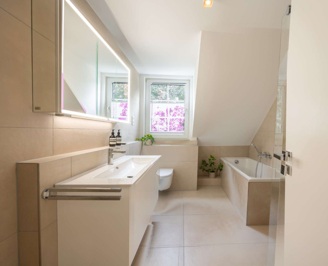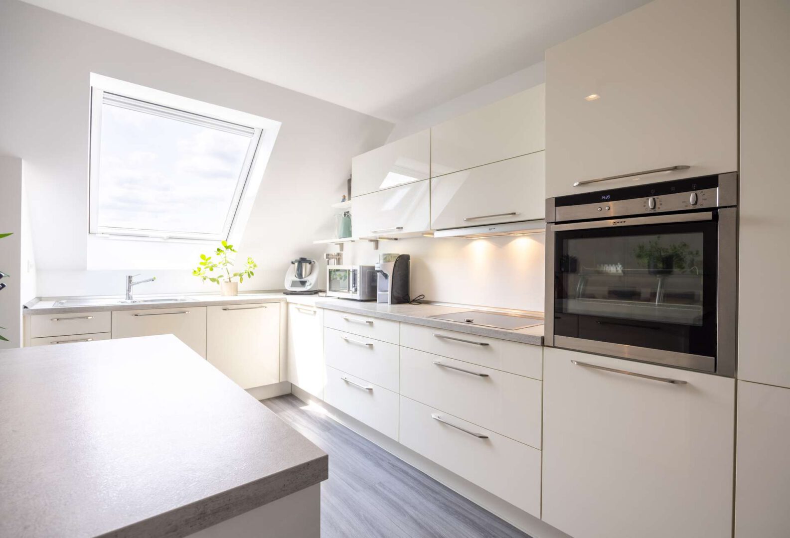 Die ca. 111 Quadratmeter große Dachgeschosswohnung erstreckt sich über vier größtenteils großzügige, lichtdurchflutete Zimmer - mit durchdachtem Grundriss und hohem Anspruch an Wohnqualität. Ergänzt wird die Wohnung durch ein elegantes Badezimmer mit Badewanne und Dusche sowie zwei separaten Abstellräumen, die praktischen Stauraum schaffen.