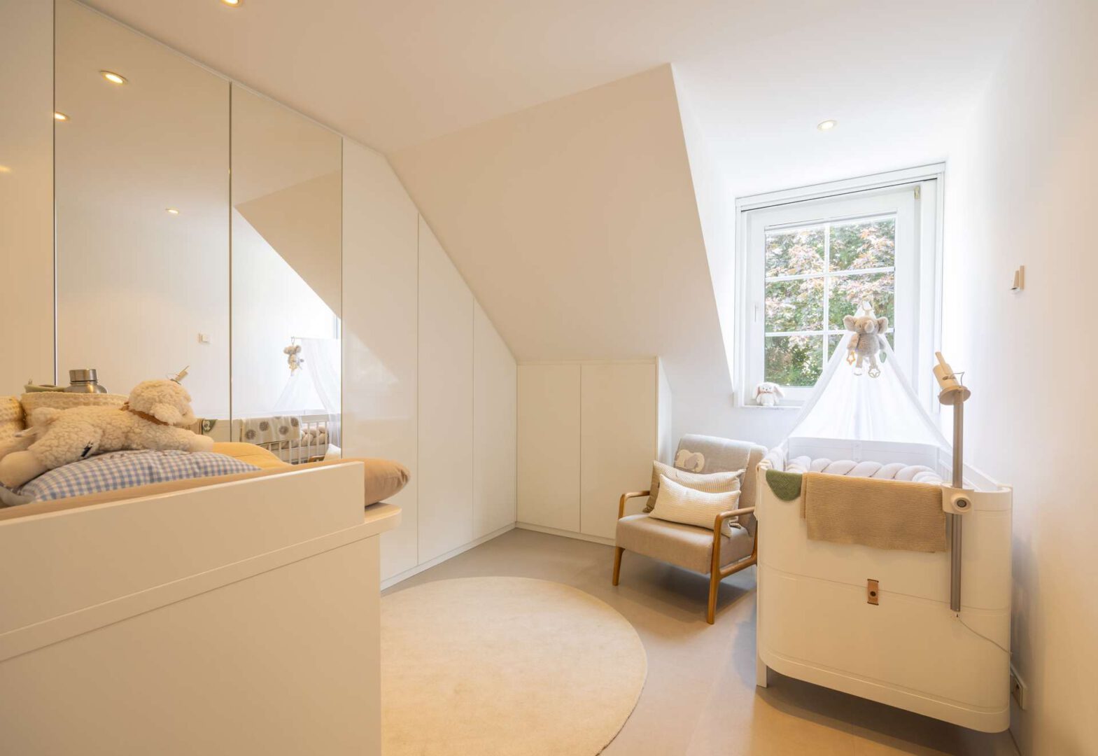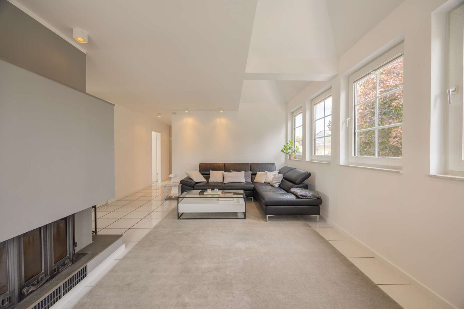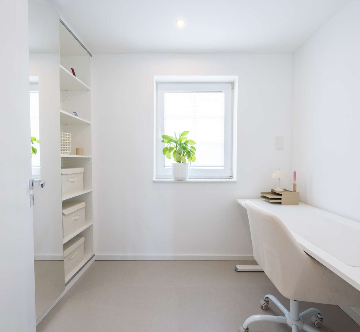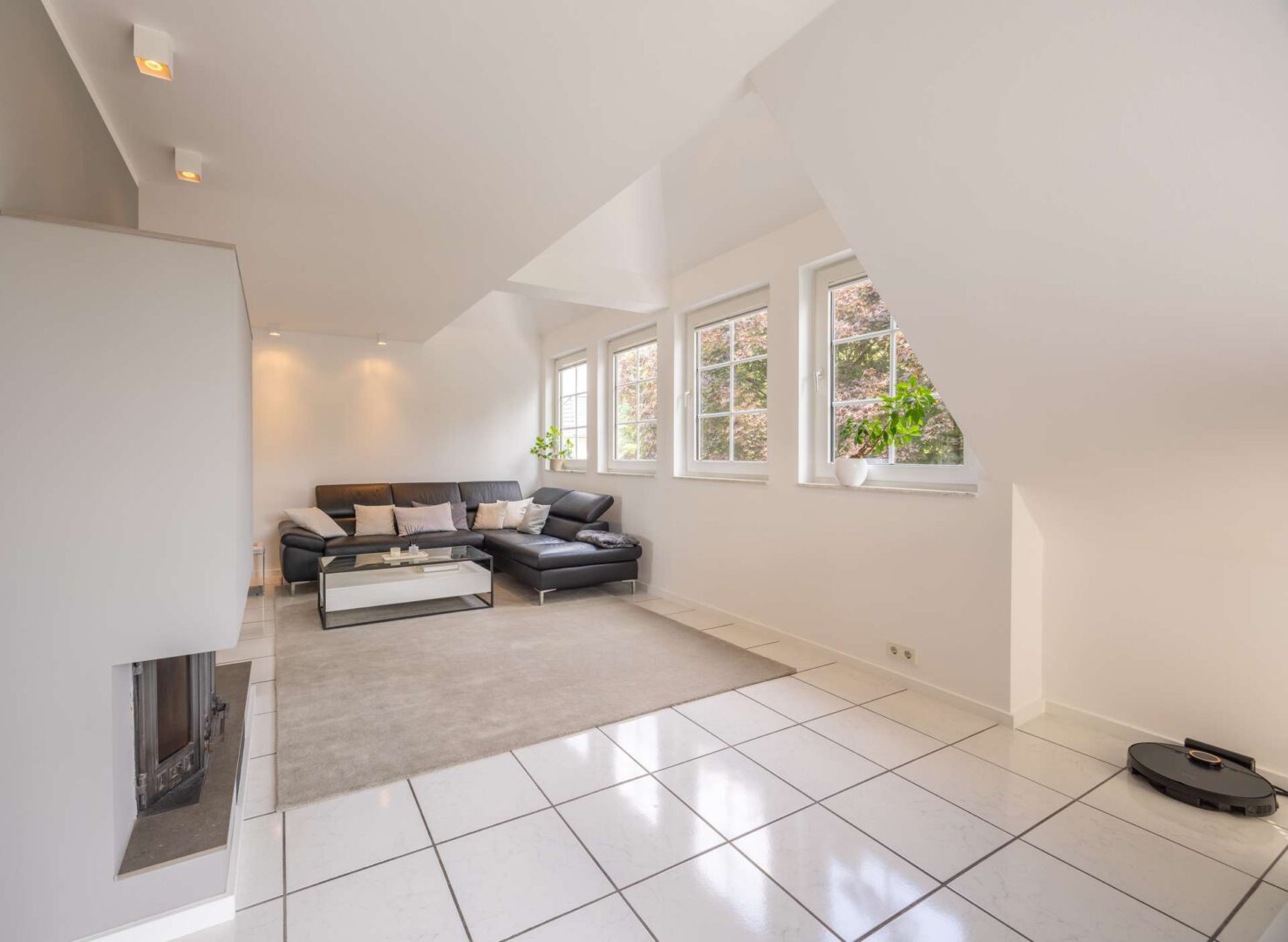 Großformatige, weiße Fliesen in den Wohnbereichen schaffen ein helles und klares Ambiente. Im Schlafzimmer, Kinderzimmer und Homeoffice sorgt ein sandfarbener Teppich für eine warme, wohnliche Atmosphäre. Im Wohnbereich lädt ein stilvoller, moderner Kamin zu gemütlichen Stunden ein. Die Fenster im Schlafzimmer sind mit elektrischen Rollläden ausgestattet und ermöglichen eine individuelle Lichtregulierung - ganz bequem auf Knopfdruck. Die restlichen Fenster wurden mit hochwertigen, maßgefertigtenPlisses ausgestattet.