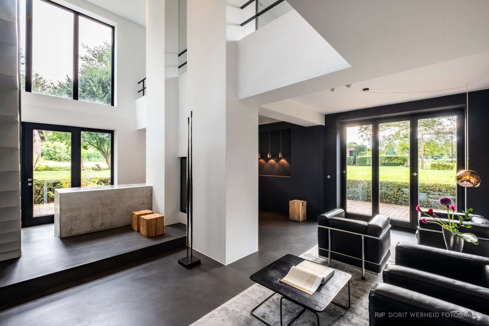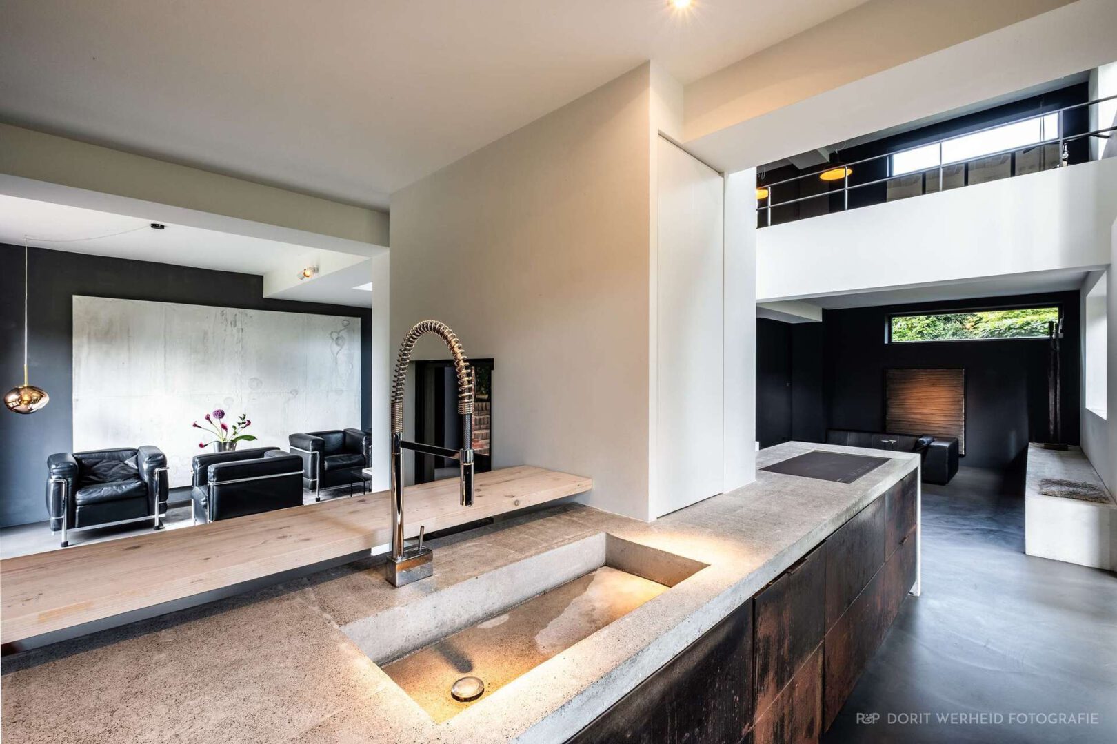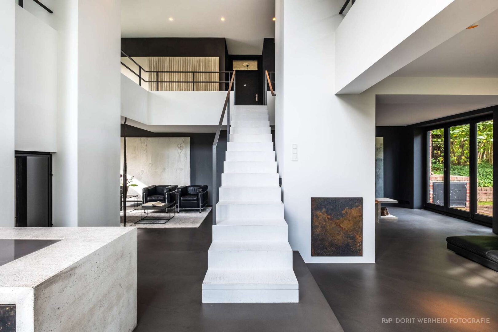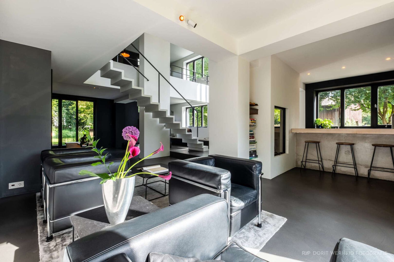 Die freischwebende Treppe strukturiert klar das Erdgeschoss und schafft trotz offener Raumgestaltung wohnliche und in sich definierte Lebenszonen. Durch zahlreiche Fensterfronten werden innen und außen über jede Sichtachse verbunden. Die offene Küche, welche eher einem Möbelstück gleicht, und den Raum durch harmonisch ausgewählte Materialien ergänzt, leitet den Blick über den Wohnbereich des Erdgeschosses bis in die offene Galerie des ersten Obergeschosses.