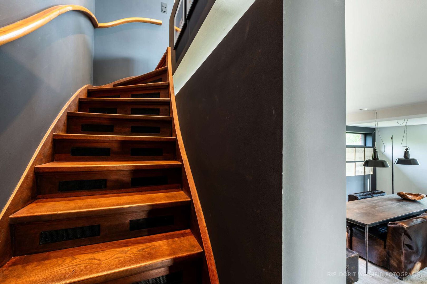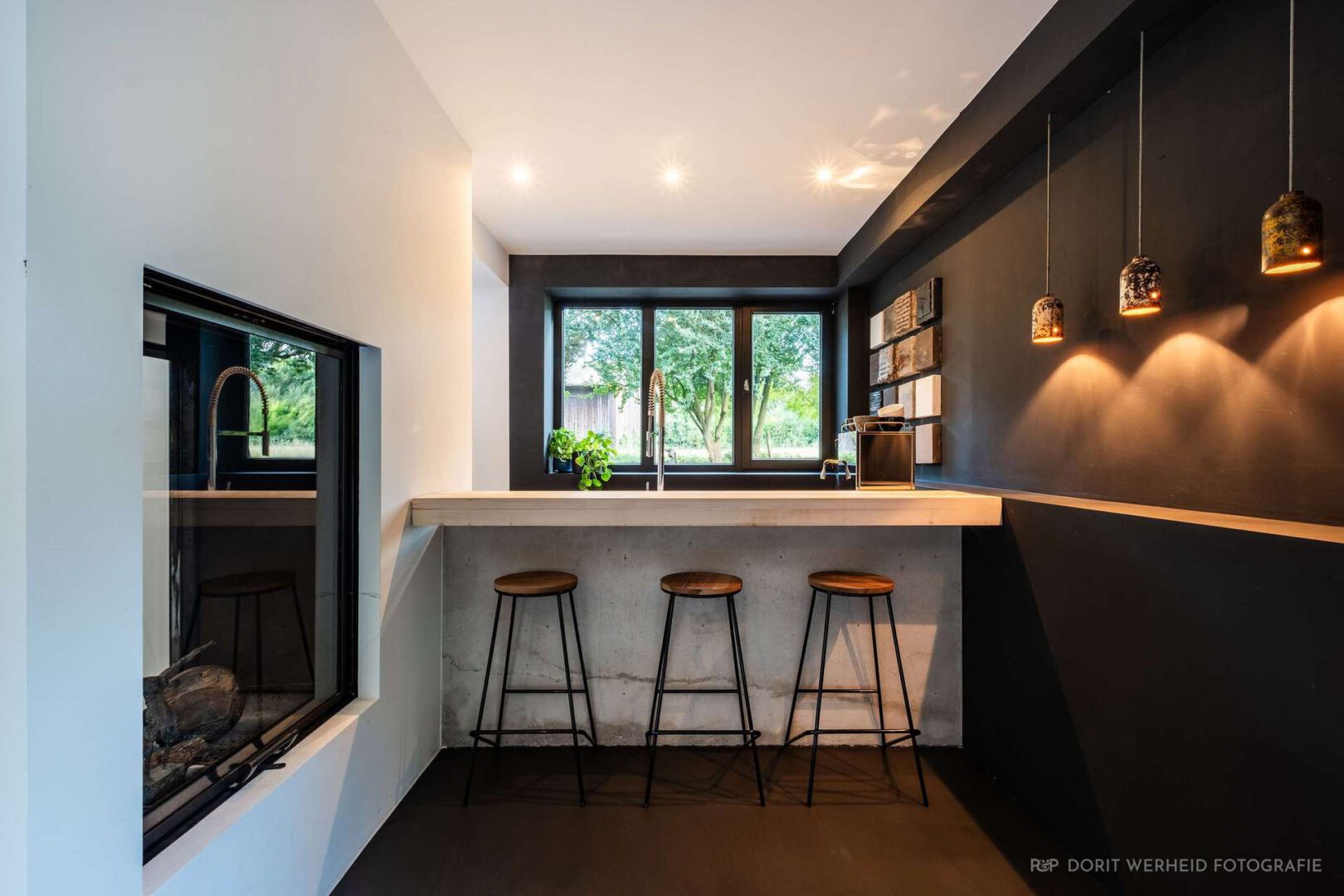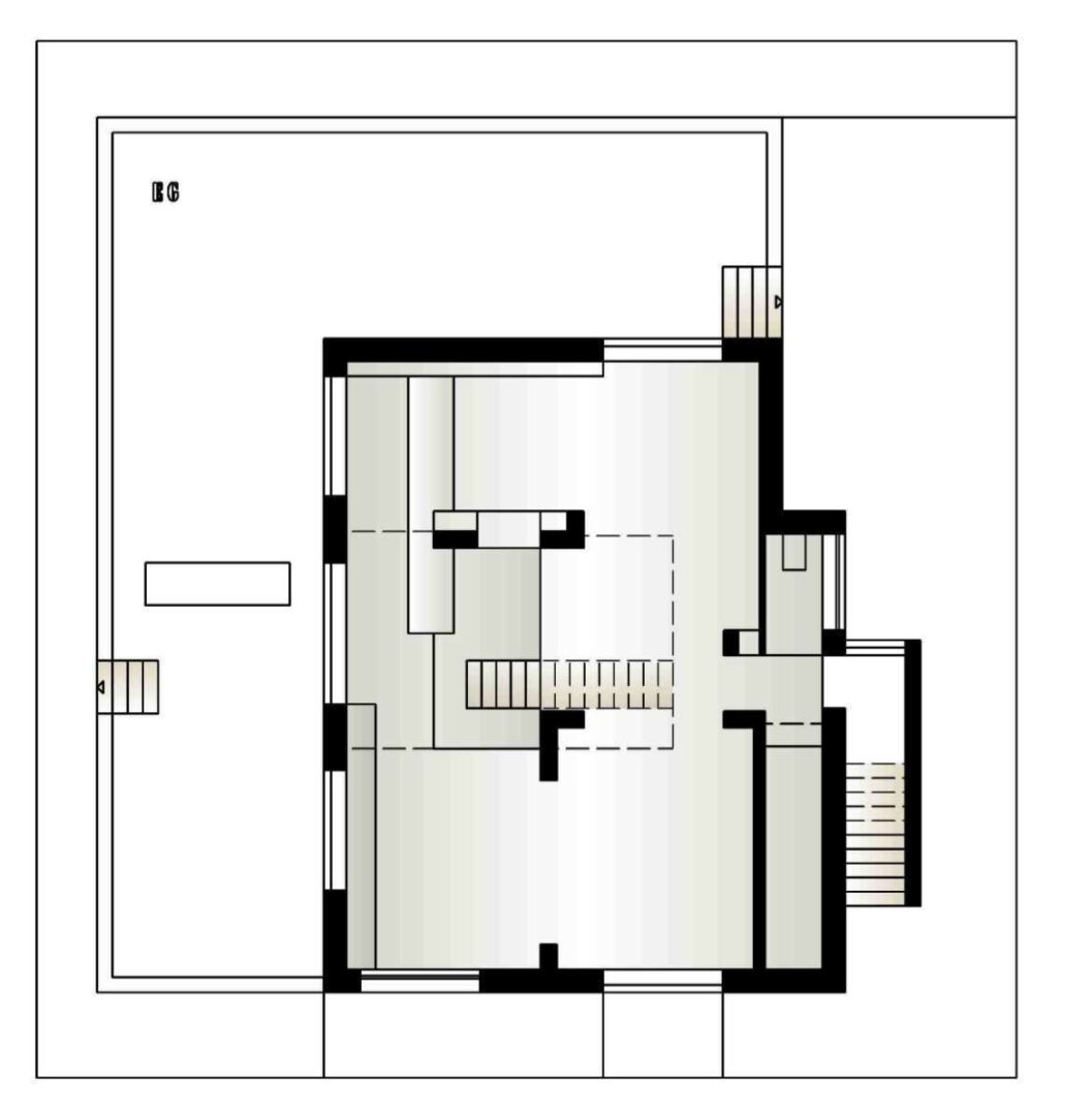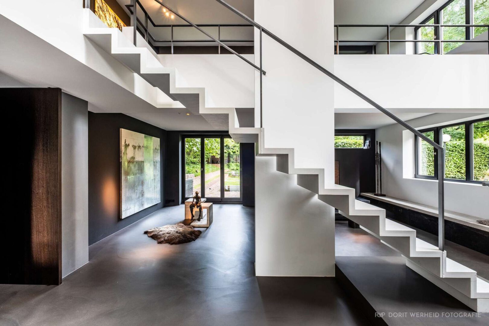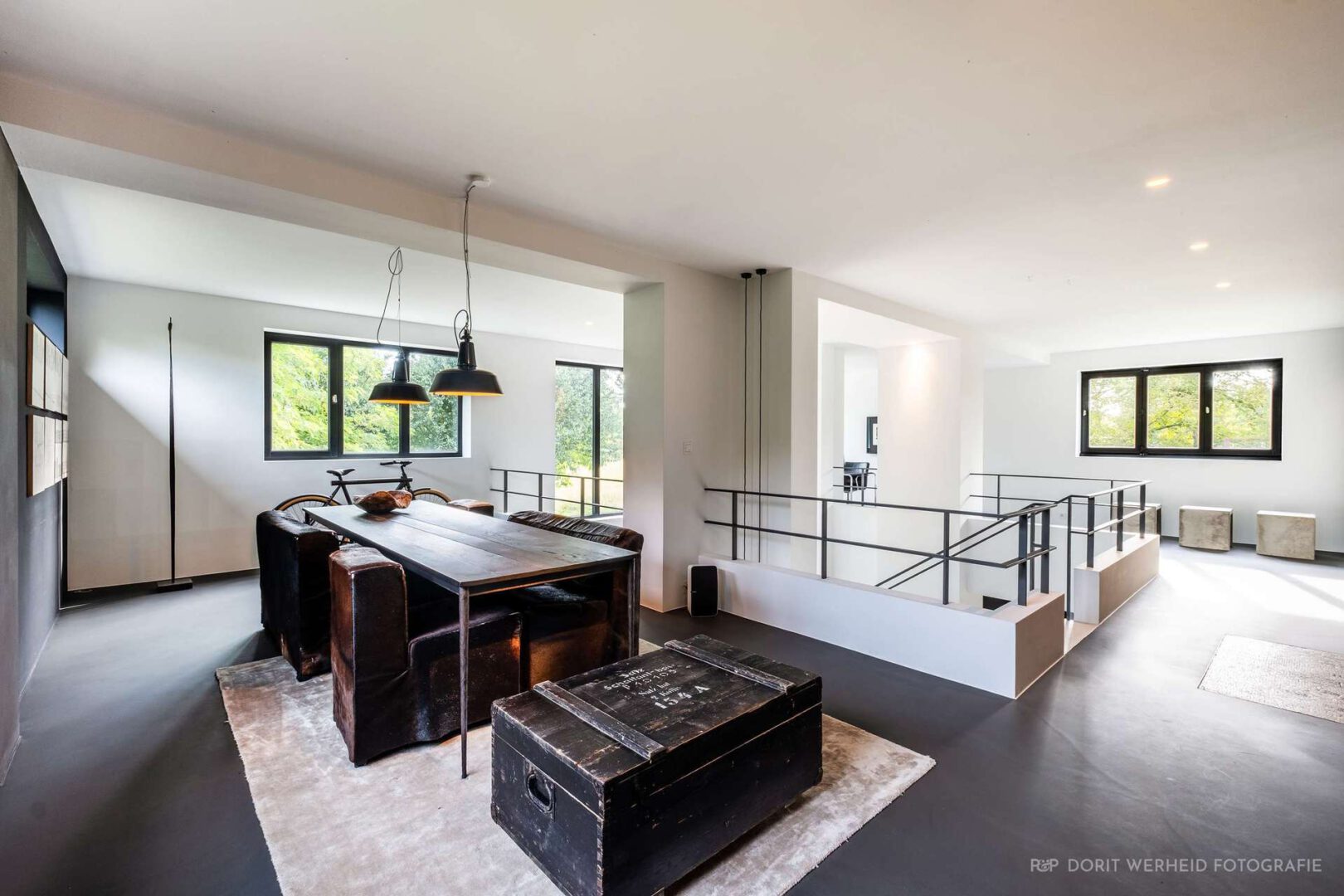 Die freischwebende Treppe strukturiert klar das Erdgeschoss und schafft trotz offener Raumgestaltung wohnliche und in sich definierte Lebenszonen. Durch zahlreiche Fensterfronten werden innen und außen über jede Sichtachse verbunden. Die offene Küche, welche eher einem Möbelstück gleicht, und den Raum durch harmonisch ausgewählte Materialien ergänzt, leitet den Blick über den Wohnbereich des Erdgeschosses bis in die offene Galerie des ersten Obergeschosses.
