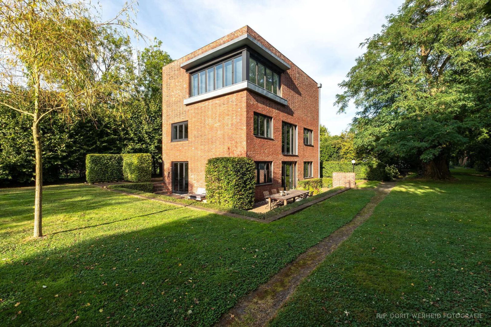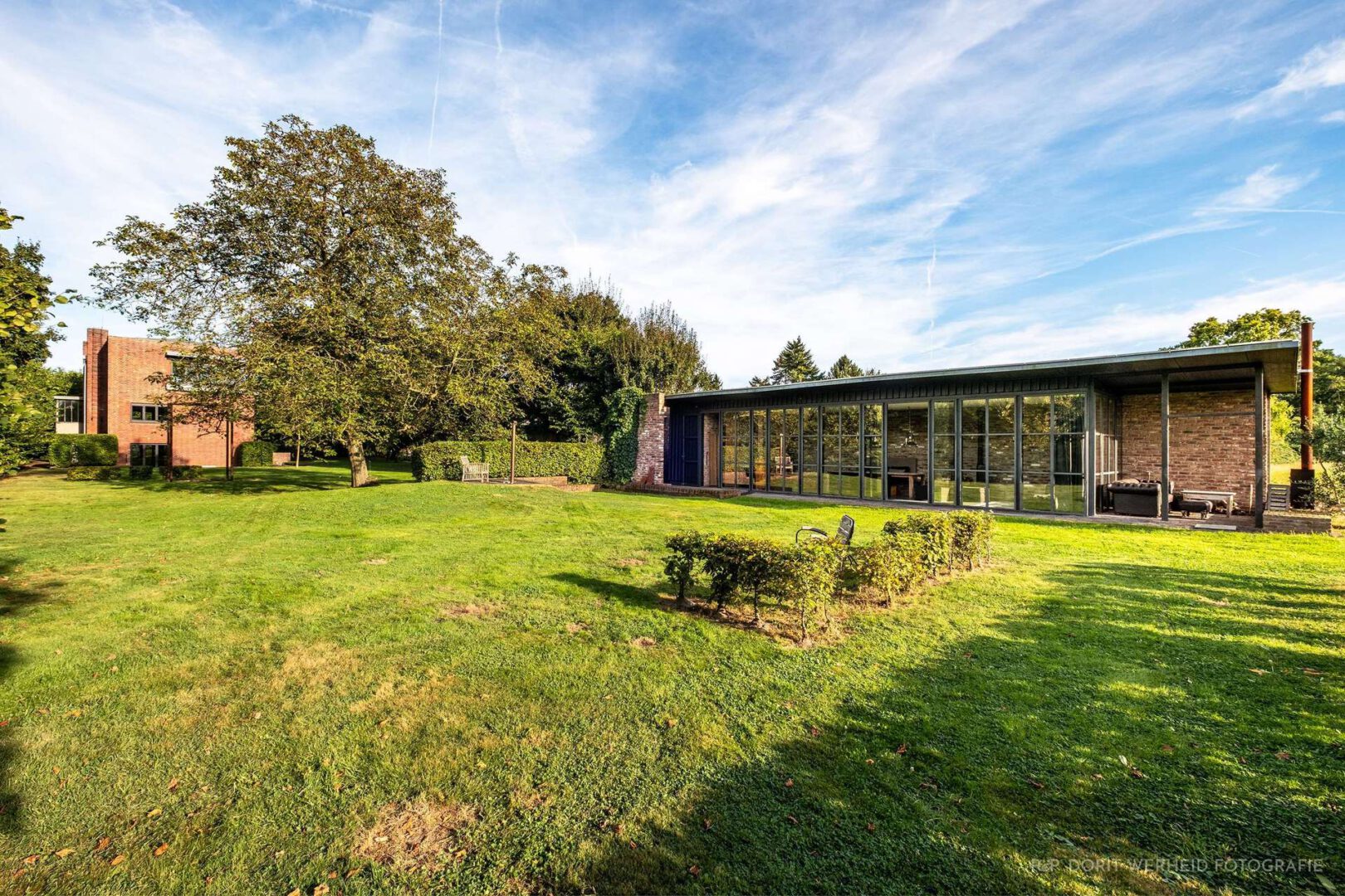 Als Zentrum des Grundstücks teilt das denkmalgeschützte Architektenhaus den parkähnlichen Garten in klar strukturierte Bereiche und leitet über eine Allee vorbei an zahlreichen Lieblingsplätzen zum Eingangsbereich des Hauses. Sichtgeschützt im hinteren Teil des Grundstücks wurde die ehemalige Scheune als Atelier oder Gästehaus mit Bedacht auf Erhaltung der ursprünglichen Substanz ebenfalls saniert und bietet durch ihren Industriecharakter einen gemütlichen Rückzugsort für gemeinsames Beisammensein. Architektonisch in das Gesamtbild fügen sich dank ausgewählter Materialien ebenfalls der bewusst zur Straße hin geschlossene Eingangsbereich des Grundstücks, sowie die zwei Garagen mit praktischer Abstellfläche ein. Zweifelsfrei eine Immobilie, die ihresgleichen sucht und für den Käufer, der als Liebhaber für Kunstgeschichte in Verbindung mit moderner Architektur, ein Angebot mit Seltenheitswert darstellt.