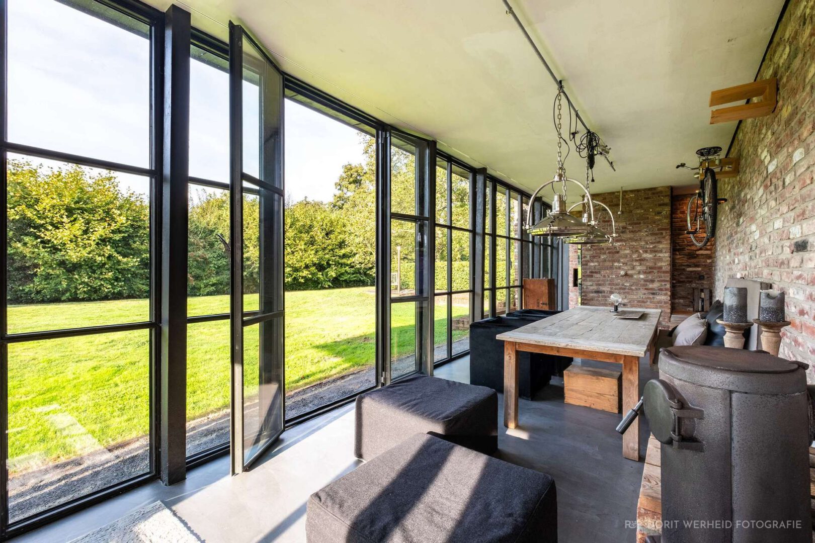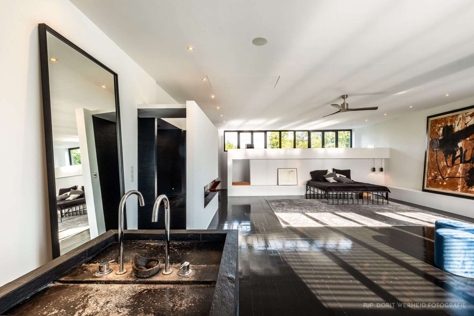 Die ursprüngliche Holztreppe verbindet die Galerieebene mit dem zweiten Obergeschoss und leitet in den über 80 Quadratmeter großen Schlafbereich mit offenem Bad und Ankleide. Das nahezu hausbreite Panoramafenster rahmt den Blick Richtung Garten und alter Scheune. Der schwarz lackierte Holzdielenboden spannt wieder die Verbindung zwischen Historie und Moderne, auch auf dieser Etage.